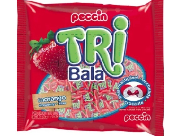 Tri bala a bala mastigável crocante recheada, no sabor morango.