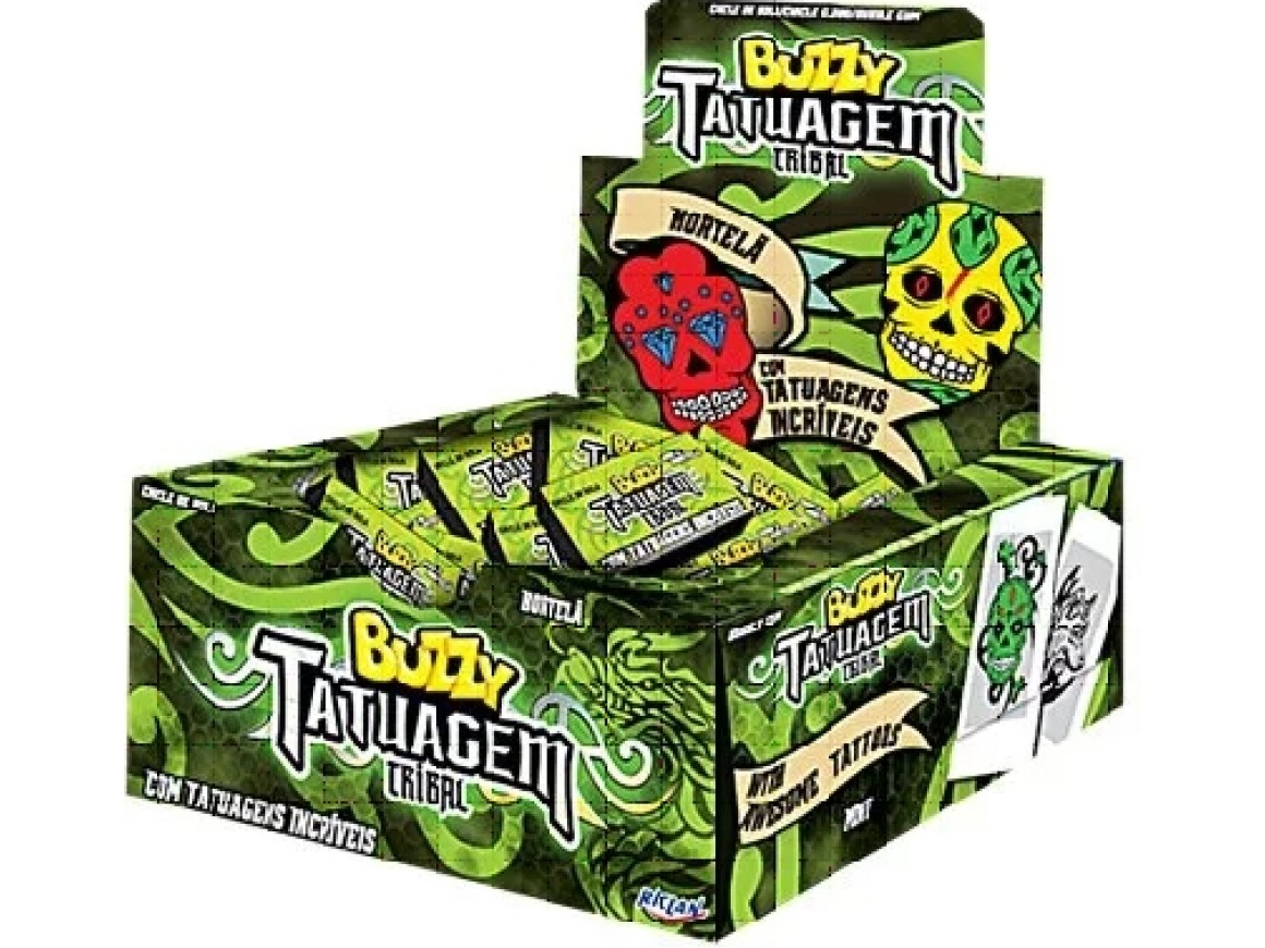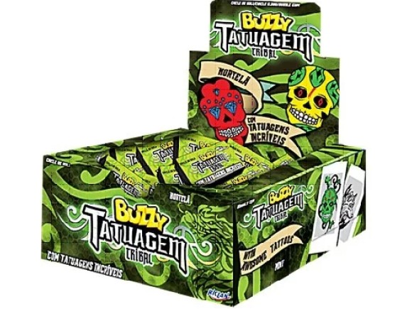 Chicle Buzzy no sabor hortelã com tatuagens iradas para você colecionar