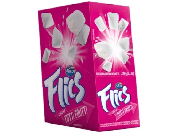 Praticidade e sabor, é com Flics. É um chiclete em pastilha que vem em uma embalagem para você ter sempre à mão. Sabor tutu-fruti. Embalagem contendo 12 cartelas de 12 chicletes cada.